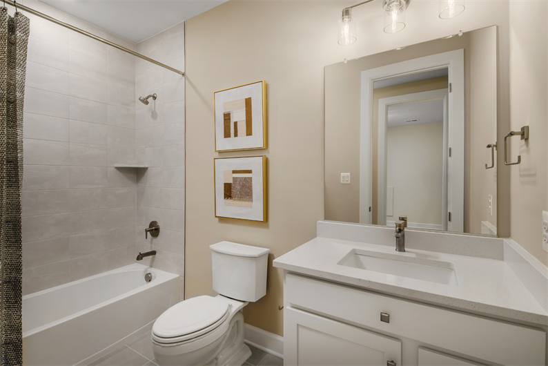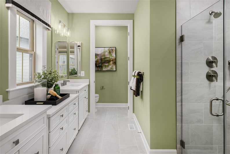 The owner's suite is a true retreat, complete with dual vanities, quartz counters, a Roman shower with a frameless glass door, tile surround, and a private water closet for ultimate comfort.