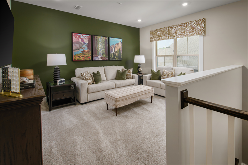 The great room features an included fireplace and connects seamlessly to the dining area and first-floor guest bedroom, offering flexibility for visitors. Upstairs, a spacious loft provides additional living space for hobbies or hosting family.