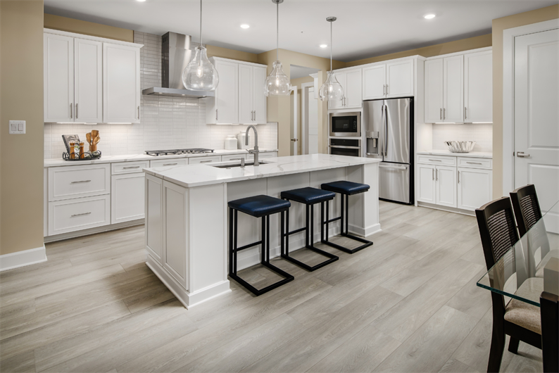 Inside, the open-concept layout is anchored by a model-like kitchen showcasing maple latte shaker-style cabinetry with soft-close doors, quartz countertops, tile backsplash, and a large island perfect for casual dining. Included stainless steel appliances (even the refrigerator) make moving in a breeze. Luxury vinyl plank flooring flows throughout the main living areas, while an oak staircase with metal balusters adds a touch of elegance.