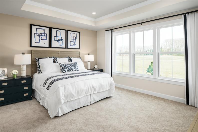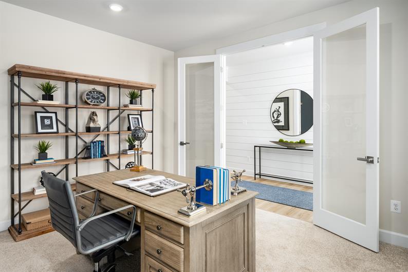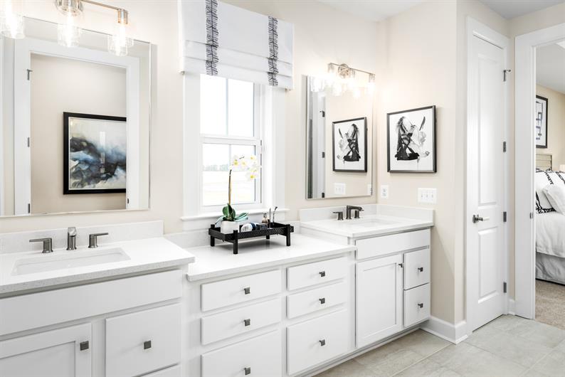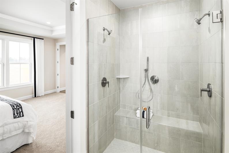 The main-level owner's suite is a true retreat, featuring a tray ceiling, large walk-in closet, and spa-inspired bath with dual vanities, quartz counters, a Roman shower with a frameless glass door, tile surround, and private water closet. A first-floor guest bedroom and flex space make hosting and working from home easy.