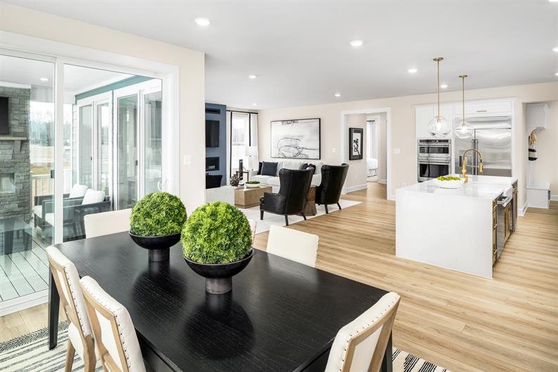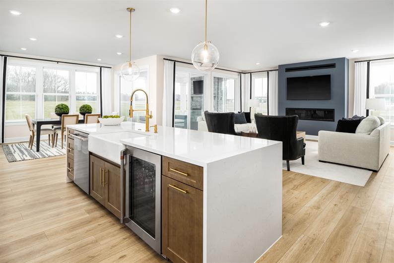 Inside, the open-concept layout shines with luxury vinyl plank flooring and thoughtful details like 8' doors, dimmer switches, and motion-sensor lighting. The gourmet kitchen is a showstopper with painted linen cabinetry, quartz countertops, a tile backsplash, and a full suite of stainless steel appliances – including the refrigerator. The oversized island flows seamlessly into the dining area and family room, anchored by a sleek gas fireplace.