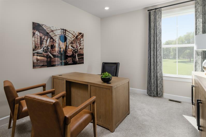 The private owner's suite offers a tray ceiling, large walk-in closet, and spa-inspired bath featuring dual vanities, quartz counters, frameless glass shower, and a private water closet. Two additional bedrooms and a dedicated study provide flexibility for guests and remote work.