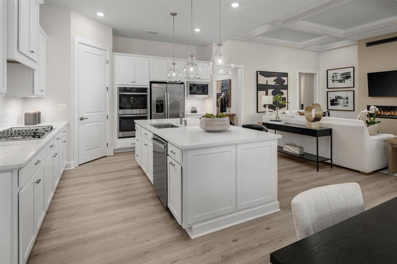 The gourmet kitchen is a chef's dream with linen cabinetry, quartz countertops, a tile backsplash, double wall oven, and a full suite of stainless steel appliances – including the refrigerator. The oversized island anchors the space, perfect for entertaining.