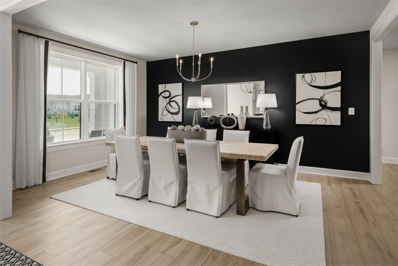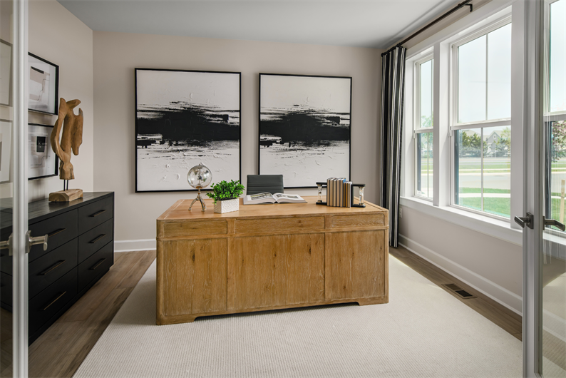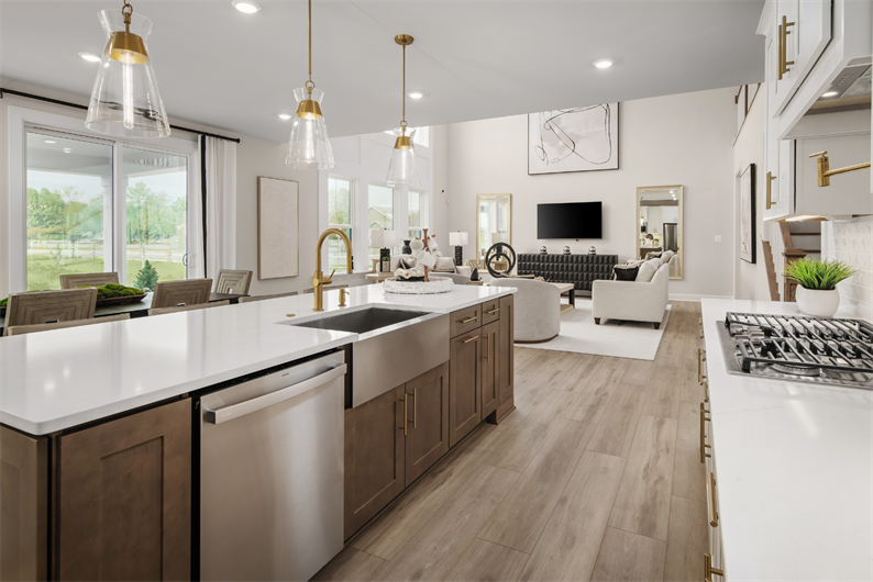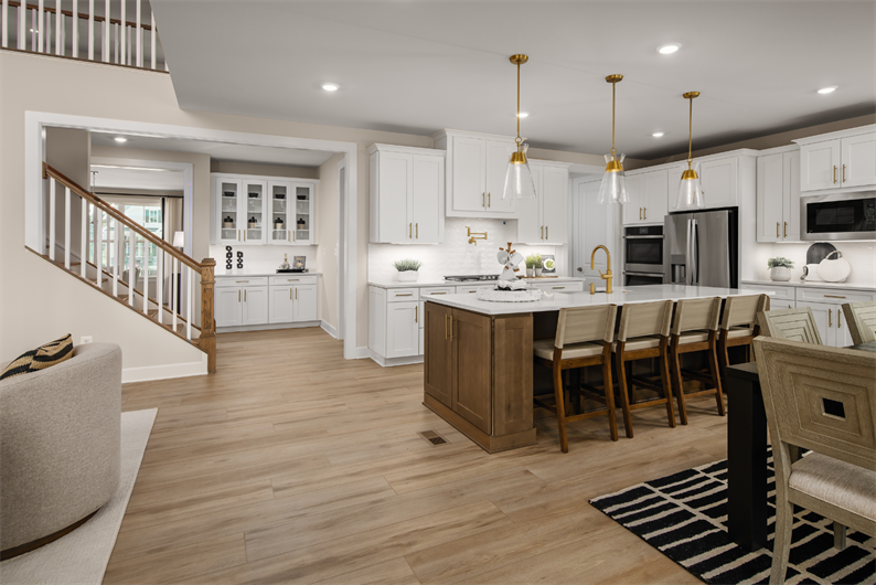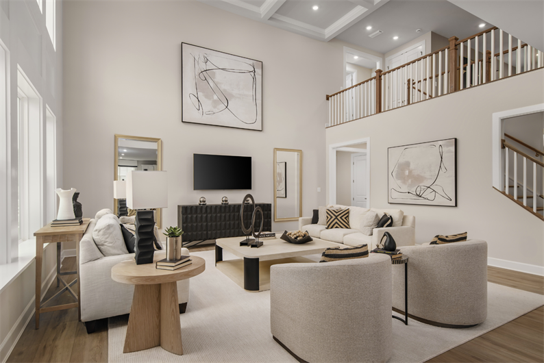 From the moment you step into the grand foyer, the Santorini impresses with elegance and thoughtful design. A formal dining room and flex space surround the entry, while a private study provides the perfect work-from-home retreat. The heart of the home is the gourmet kitchen, featuring linen cabinetry, quartz countertops, a tile backsplash, double wall oven, and a full suite of stainless steel appliances – including the refrigerator. The oversized island flows seamlessly into a sunlit dining area and soaring two-story family room with a coffered ceiling and a cozy fireplace.