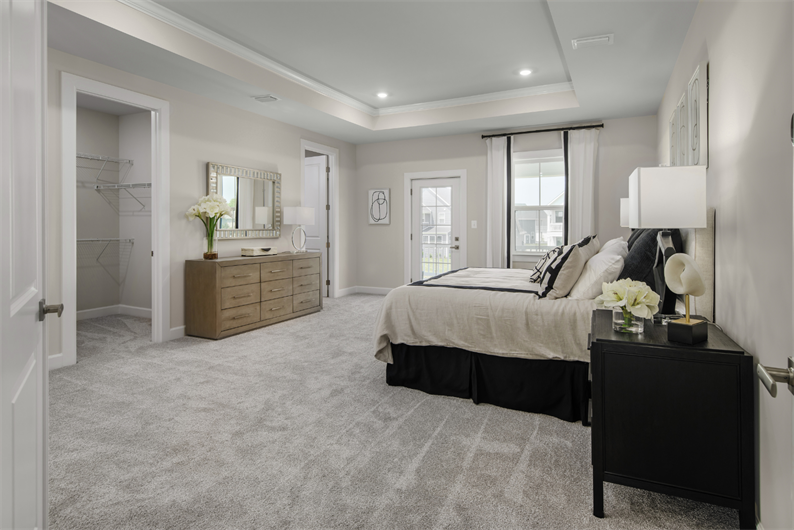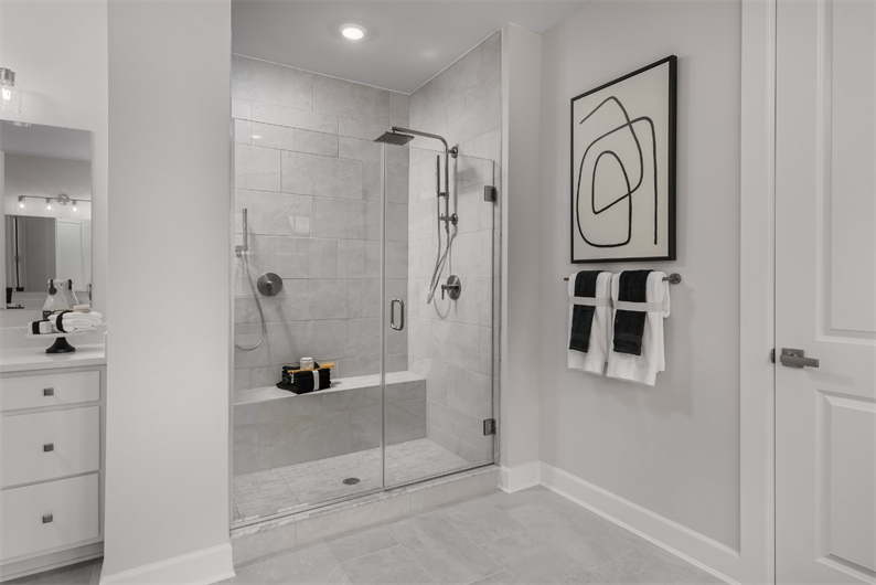 Step outside to the rear covered porch and enjoy a private wooded backdrop – ideal for entertaining or relaxing. Upstairs, three spacious bedrooms each offer en suite baths and walk-in closets. The owner's suite is a true sanctuary with dual walk-in closets, tray ceiling, and a spa-inspired bath featuring dual vanities, quartz counters, a frameless glass shower, tile surround, a private water closet, and a freestanding soaking tub for ultimate relaxation.