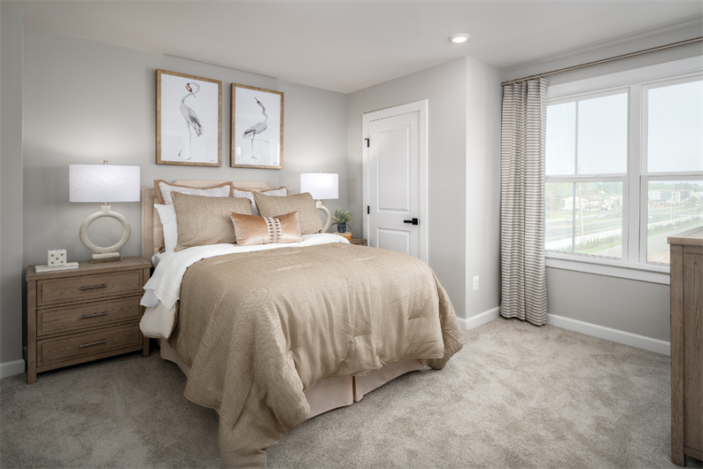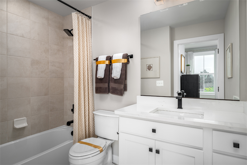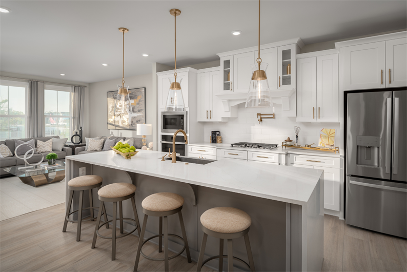 The well-appointed kitchen is designed to impress, featuring painted linen cabinetry, quartz countertops, ceramic tile backsplash, hooded vent, black fixtures, farmhouse sink, pot filler, pendant lighting, and under-cabinet lighting. A stainless steel appliance package – including the refrigerator – makes move-in day that much easier.