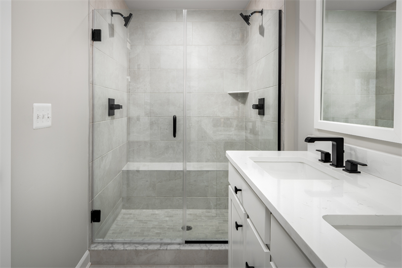 The owner's bath offers a spa-inspired experience with a Roman shower, frameless glass door, tile surround, dual vanities, black fixtures, and a tray ceiling. Additional conveniences include a kitchen island and included washer and dyer.