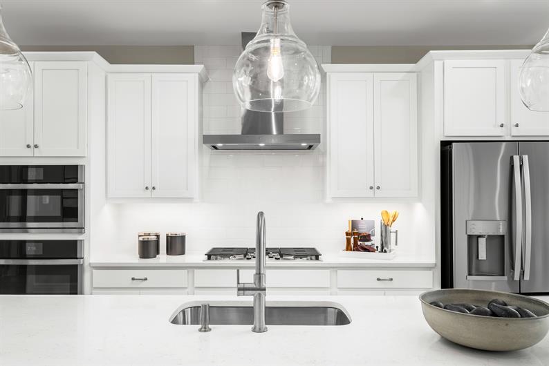 This beautifully curated Kensington home features an open-concept kitchen, dining area, and great room ideal for everyday living and entertaining. The gourmet kitchen includes upgraded white linen cabinetry, quartz countertops, an oversized island, tile backsplash, and premium CAFE appliances including a double wall oven, hooded vent, pot filler, and refrigerator. The great room showcases a coffered ceiling and luxury vinyl plank flooring throughout the first floor. A rear deck with privacy fence extends your living space outdoors. The exterior features Hardie Plank siding and a partial stone façade for added curb appeal.