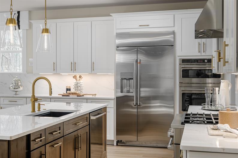 • Designer kitchens with quartz countertops and GE® stainless steel appliances